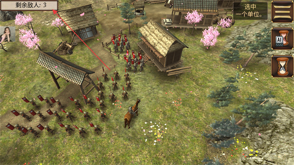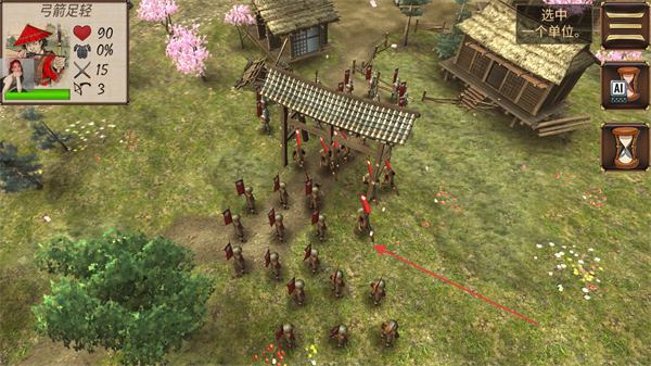 2、在戰(zhàn)場中選中弓箭足輕等單位,指揮其在村莊區(qū)域戰(zhàn)斗,推進(jìn)戰(zhàn)線。