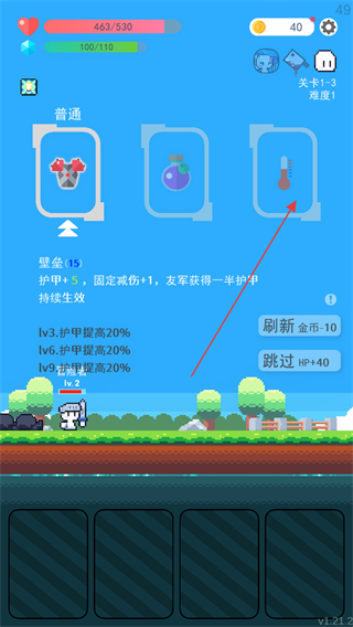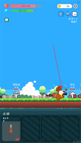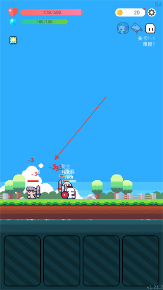2、冒險(xiǎn)的道路上會(huì)隨機(jī)出現(xiàn)劍士或怪物來阻擋前進(jìn),角色會(huì)自動(dòng)攻擊他們,但是要時(shí)刻注意自己的血量。
