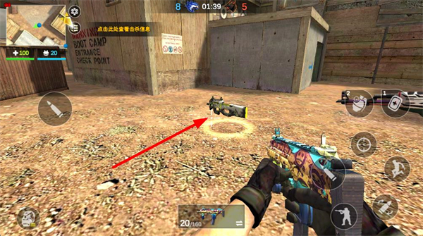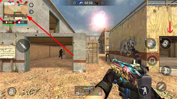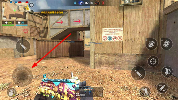1、進入游戲后,通過左下角虛擬搖桿操控角色移動,可在戰(zhàn)場中自由穿梭,利用掩體躲避敵人攻擊,尋找有利位置發(fā)起進攻。