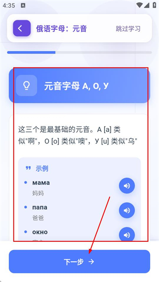 2、在俄語闖關頁面,選擇要學習的關卡,進入學習頁面。