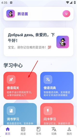 1、在鵝語菌首頁,點擊俄語闖關選項,進入俄語闖關頁面。