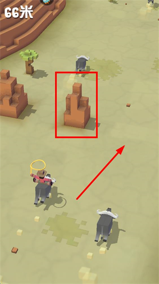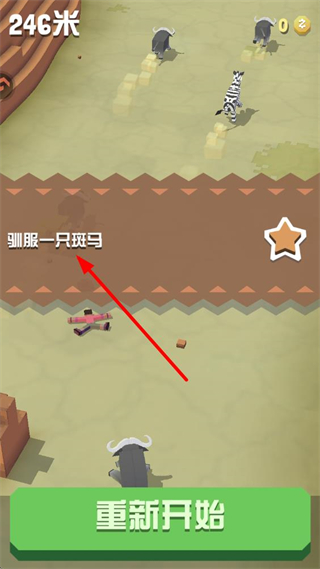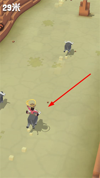 1、點擊開始游戲進入跑酷場景,通過滑動屏幕操控牛仔移動方向,在動物群中選擇目標騎乘,騎乘后動物會自動奔跑。