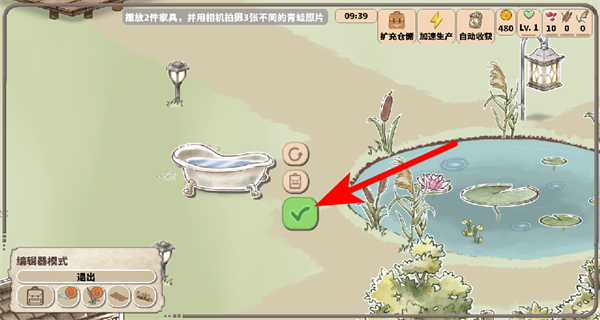 3、在編輯模式下布置好家具后,點(diǎn)擊綠色對(duì)勾按鈕確認(rèn)布置,完成家園裝飾操作,為青蛙打造舒適居住環(huán)境。