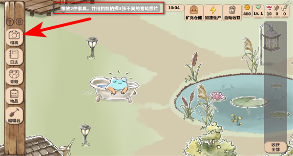 4、點(diǎn)擊左側(cè)菜單的相機(jī)功能,按照任務(wù)要求拍攝青蛙照片,完成拍攝不同青蛙照片的任務(wù),推進(jìn)游戲進(jìn)程。