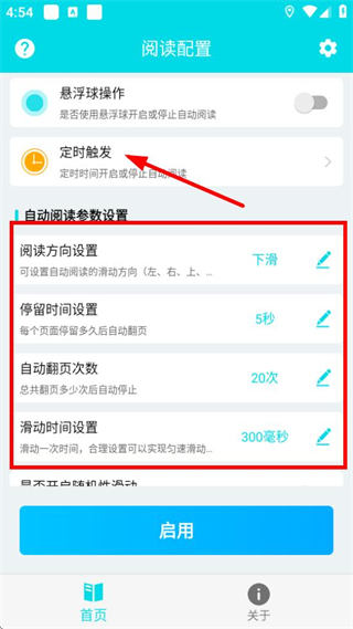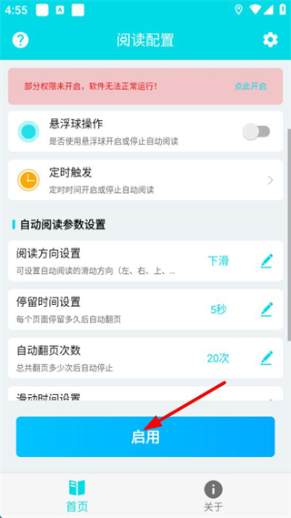 3、回到閱讀配置頁(yè)面點(diǎn)擊啟用按鈕可啟用自動(dòng)閱讀功能。