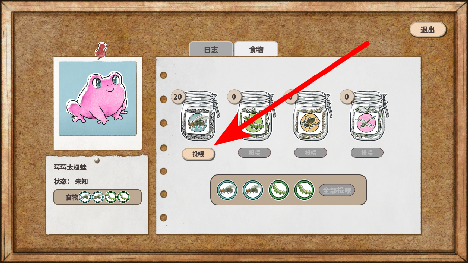 2、進(jìn)入青蛙的食物界面,點(diǎn)擊投喂按鈕,投喂對應(yīng)食物,滿足青蛙飲食需求,推動其狀態(tài)發(fā)展。