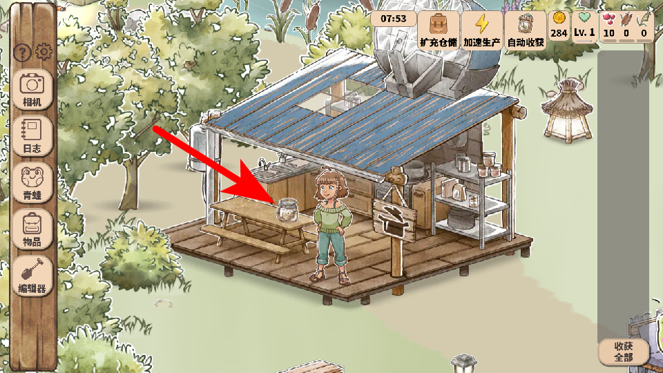 3、投喂完青蛙后,可以在制作區(qū)域的罐子處進(jìn)行食材處理,這是加工資源、制作食物的關(guān)鍵步驟。