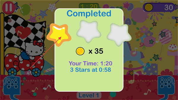 4、帶領(lǐng)凱蒂貓安全到達(dá)終點(diǎn),會(huì)根據(jù)賽道的通關(guān)用時(shí)和獲得金幣的數(shù)量進(jìn)行評(píng)星。