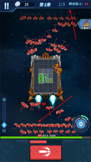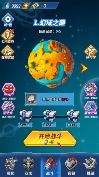 1、點擊開始戰(zhàn)斗,進入太空戰(zhàn)斗場景,消耗資源開啟戰(zhàn)斗,抵御敵人進攻。