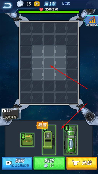 2、在戰(zhàn)斗準備界面布置武器,選擇合適的武器放置在格子中,為戰(zhàn)斗做好準備。