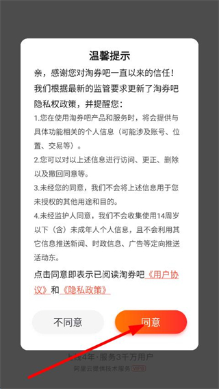 1、在溫馨提示彈窗中,點擊同意,進(jìn)入淘券吧首頁。