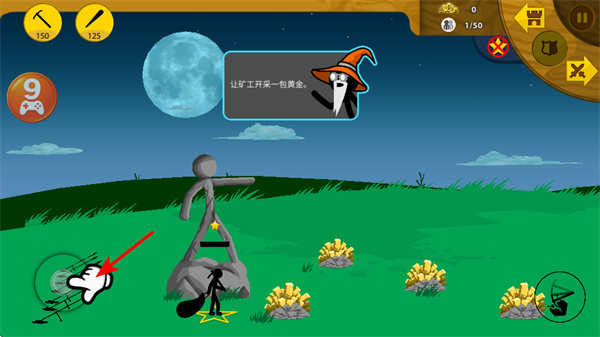 2、點(diǎn)擊左上方錘子圖標(biāo),可訓(xùn)練礦工,礦工能開采黃金資源,為軍隊(duì)建設(shè)和戰(zhàn)斗提供資金支持,是發(fā)展的關(guān)鍵操作。