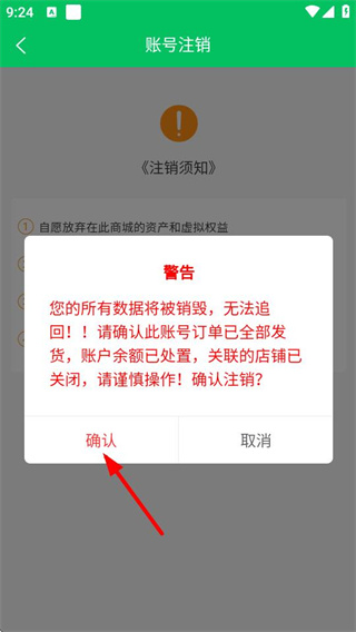 6、在注銷警告彈窗中點擊確認按鈕,完成賬號注銷。