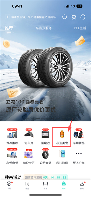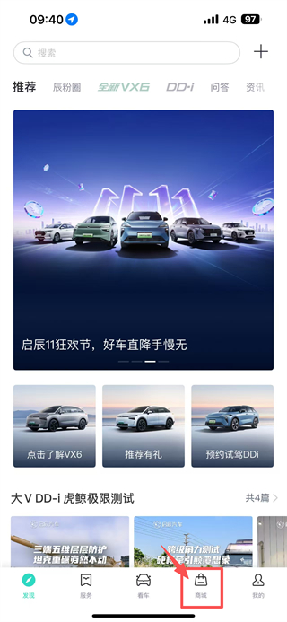 1、打開汽車服務(wù)類APP,點(diǎn)擊底部商城選項(xiàng),進(jìn)入商城頁面。