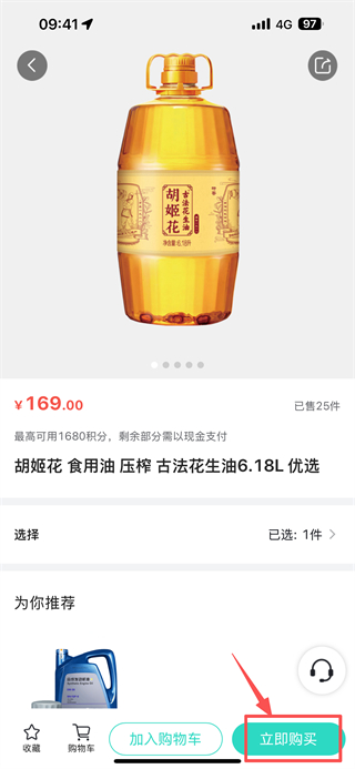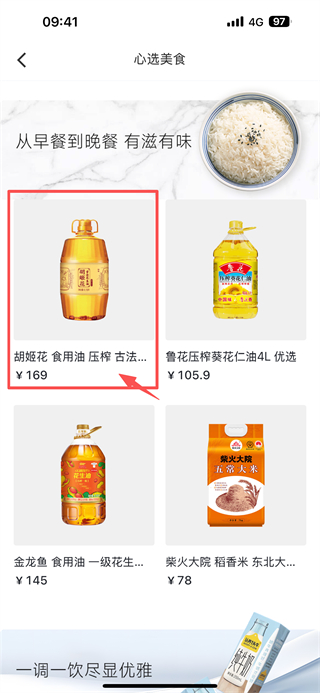 3、在心選美食商品列表頁面,選擇胡姬花食用油壓榨古法花生油6.18L 優(yōu)選商品,進(jìn)入商品詳情頁面。