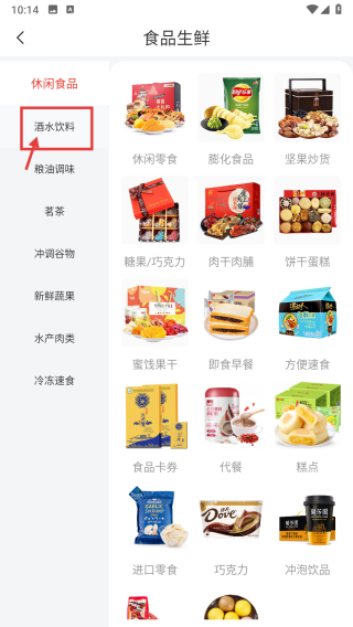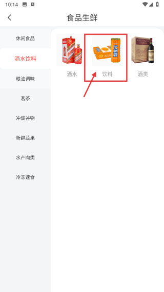 2、在食品生鮮頁(yè)面,點(diǎn)擊酒水飲料分類標(biāo)簽,進(jìn)入酒水飲料分類頁(yè)面。