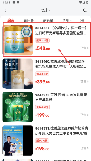 4、在飲料商品列表頁(yè)面,查看進(jìn)口哈薩克斯坦養(yǎng)多冠駱駝全脂奶粉商品詳情。