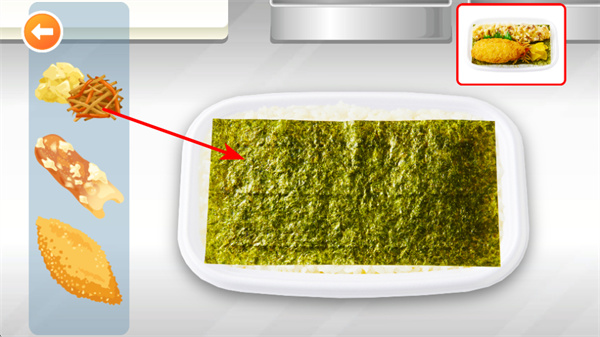 4、在組裝便當環(huán)節(jié),點擊左側的配菜如炸物、炒絲等,將其放置到鋪有海苔的米飯上,完成便當?shù)慕M裝,做出完整海苔便當。