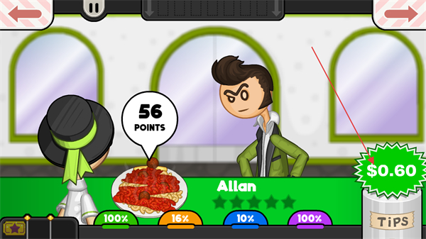 4、根據(jù)做出的菜品獲得的顧客評(píng)分收獲到一定的金額作為收益。