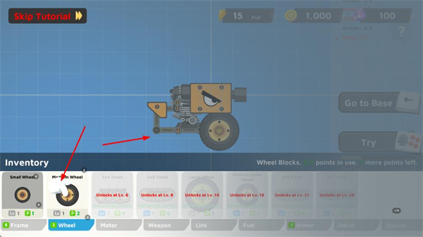 2、在戰(zhàn)車建造界面,從inventory中選擇部件組裝戰(zhàn)車,打造個性化戰(zhàn)斗車輛。