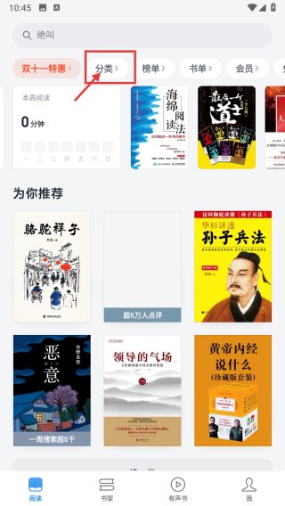 1、打開(kāi)閱讀類APP,點(diǎn)擊分類選項(xiàng),進(jìn)入分類頁(yè)面。