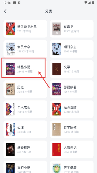 2、在分類頁(yè)面,點(diǎn)擊精品小說(shuō)分類標(biāo)簽,進(jìn)入精品小說(shuō)書籍列表頁(yè)面。