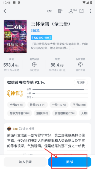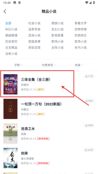 3、在精品小說(shuō)書籍列表頁(yè)面,選擇三體全集全三冊(cè)書籍,進(jìn)入書籍詳情頁(yè)面。