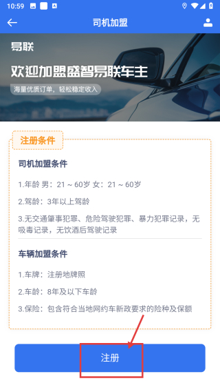 2、在司機加盟頁面,點擊注冊按鈕,進入加盟方式頁面。