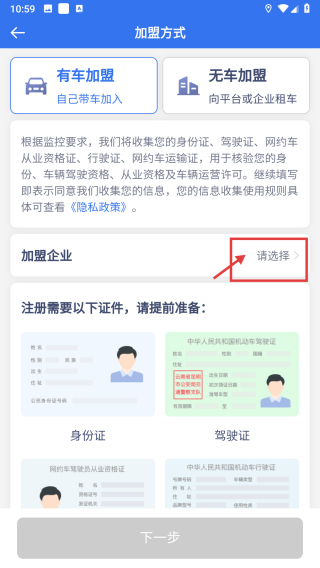 3、在加盟方式頁面,點擊加盟企業(yè)的請選擇選項,進入選擇加盟企業(yè)頁面。