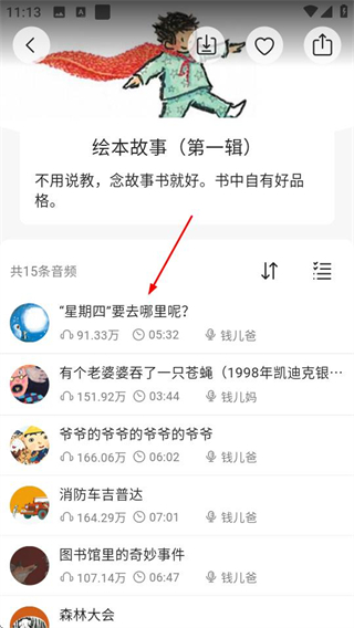 3、在繪本故事列表頁面,選擇要收聽的故事,進入故事播放頁面。
