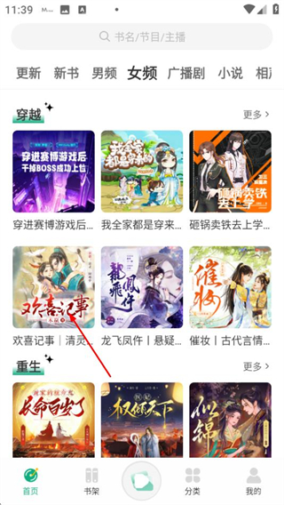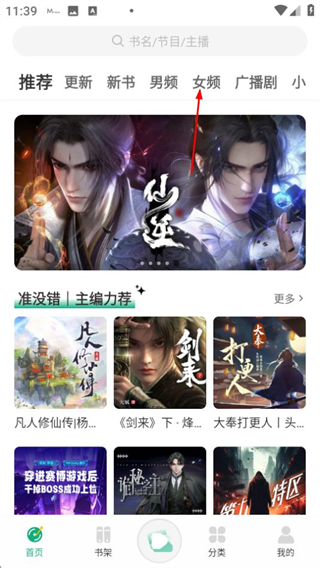1、在小梨聽書首頁,點(diǎn)擊女頻選項(xiàng),進(jìn)入女頻小說頁面。