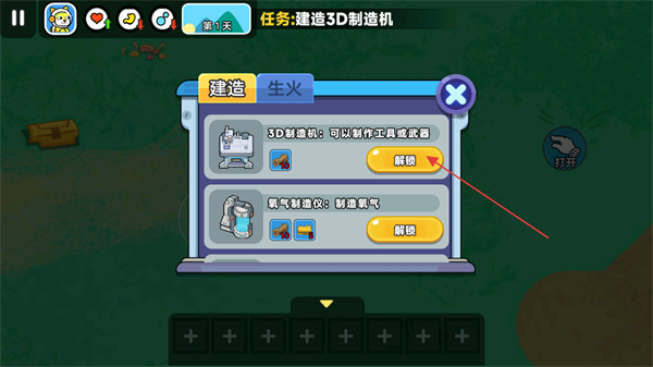 4、在飛機殘骸處點擊打開,可以進行機器的建造,查看需要的物資進行收集后解鎖建造。