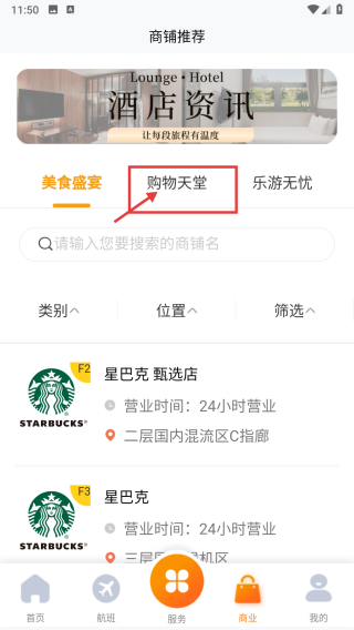 2、在商鋪推薦頁面,點擊購物天堂分類標(biāo)簽,進入購物天堂商鋪列表頁面。