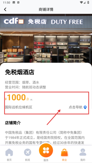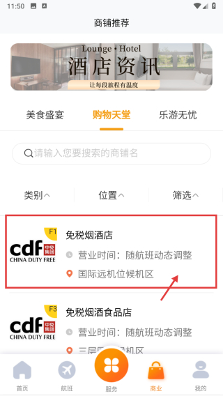 3、在購物天堂商鋪列表頁面,選擇免稅煙酒店商鋪,進入商鋪詳情頁面。