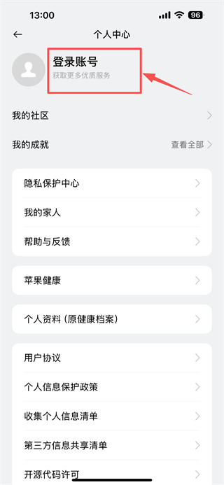 2、在個(gè)人中心頁(yè)面,點(diǎn)擊登錄賬號(hào)選項(xiàng),進(jìn)入賬號(hào)登錄頁(yè)面。