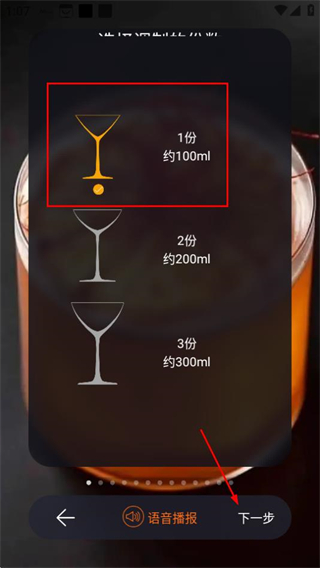 4、選擇制作份量后點(diǎn)擊下一步按鈕,可按照步驟制作該酒品。