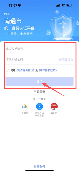 4、在登錄頁面,輸入手機(jī)號,獲取驗(yàn)證碼后輸入驗(yàn)證碼,點(diǎn)擊登錄,完成登錄操作。