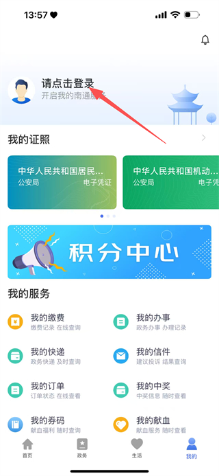 3、在個人頁面,點(diǎn)擊請點(diǎn)擊登錄,進(jìn)入南通市統(tǒng)一身份認(rèn)證平臺登錄頁面。