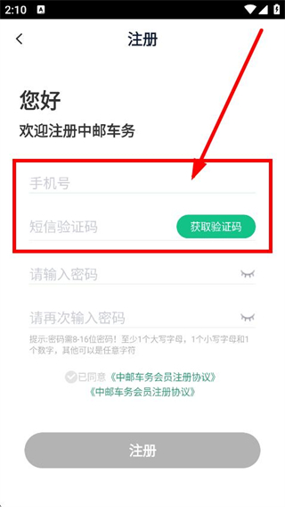 4、在注冊(cè)頁(yè)面,輸入手機(jī)號(hào),獲取驗(yàn)證碼并輸入短信驗(yàn)證碼。