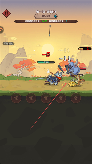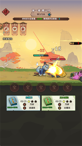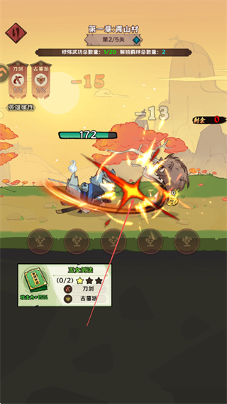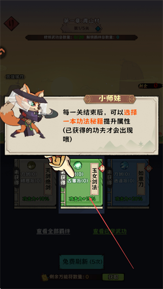 4、持續(xù)選擇和裝備不同的功法秘籍,不斷提升角色屬性,應(yīng)對更強的怪物,順利通過第一章·漫山村的各小關(guān)卡。