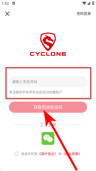 3、在登錄頁面,輸入手機(jī)號碼,點(diǎn)擊獲取短信驗(yàn)證碼。