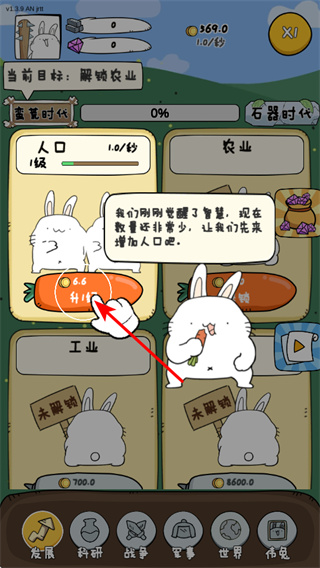 1、在發(fā)展界面,點(diǎn)擊如胡蘿卜標(biāo)識的人口提升區(qū)域,可增加人口數(shù)量,這是推動文明發(fā)展的基礎(chǔ)操作,工業(yè)等發(fā)展提供人力支撐,需優(yōu)先提升。