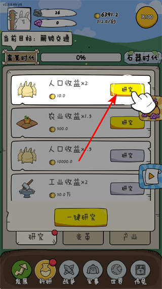 3、在科研界面,點(diǎn)擊如人口收益×2的研究按鈕,可提升對應(yīng)領(lǐng)域的收益效率,這是優(yōu)化資源產(chǎn)出的關(guān)鍵操作,研究后能顯著提升人口帶來收益。