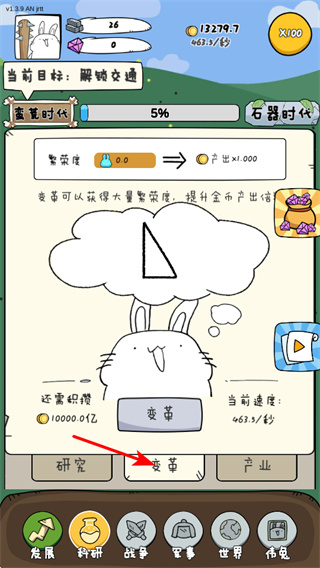 4、點(diǎn)擊變革按鈕,可觸發(fā)文明變革進(jìn)程,變革能大幅提升金幣產(chǎn)出等收益,是文明進(jìn)階的關(guān)鍵操作,完成變革可推動文明進(jìn)入新階段,開啟可能。