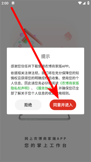 1、打開農(nóng)博商家版,在提示彈窗中,點(diǎn)擊同意并進(jìn)入。