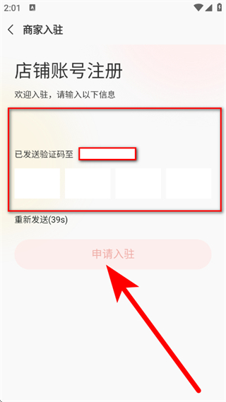 4、輸入驗證碼后,點(diǎn)擊申請入駐,完成店鋪賬號注冊。