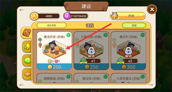 2、在建設頁,選擇魔法歷史(初級)課程,消耗200金幣解鎖建造。