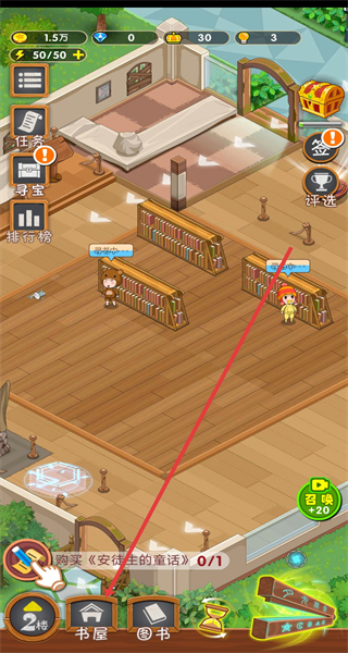 1、進(jìn)入游戲圖書館場景,點擊箭頭指向的書屋按鈕,進(jìn)入書屋。