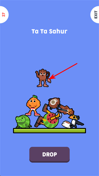 2、點(diǎn)擊DROP可將其放置在平臺(tái)上,這是堆疊角色構(gòu)建結(jié)構(gòu)的核心操作。放置時(shí)要關(guān)注平臺(tái)空間和已有角色位置,每次放置都能為后續(xù)堆疊奠定基礎(chǔ)。