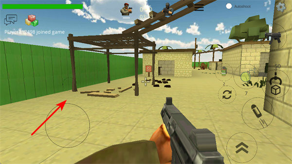 2、游戲中通過左側(cè)虛擬搖桿操控角色移動,這是躲避敵人火力、尋找掩體的基礎操作,需注意場景中的建筑和障礙物。